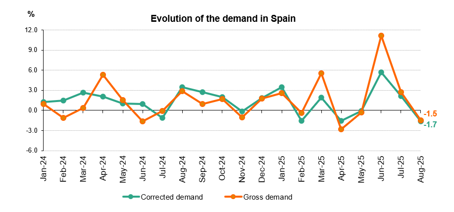 In the Balearic Islands, electricity demand in August declined by 0.6% when adjusting for labour and temperature effects, although gross demand for the month is estimated at 735,539 MWh—0.3% higher than the previous year.
