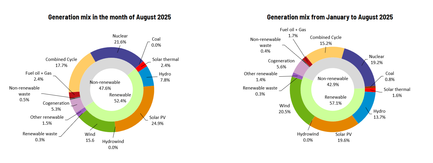 Regarding the share of different technologies, renewables generated 0.7% more in August than in the same month in 2024, with a total of 12,318 GWh. This represented a 52.4% share of total electricity generation, according to the data available today. Moreover, this month, 74.1 % of electricity generation came from technologies that do not emit CO2 equivalent.