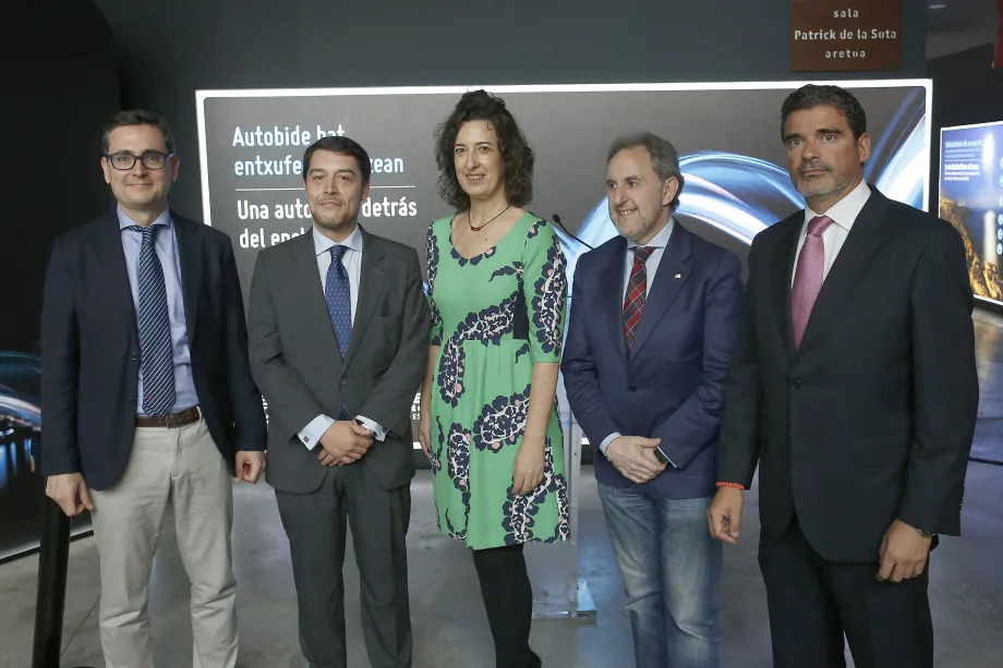 De izquierda a derecha, Jon Ruigómez, director del Museo Marítimo Ría de Bilbao; Francisco Ruiz, director corporativo adjunto al consejero delegado de Red Eléctrica de España; Lorea Bilbao, presidenta del Patronato del Museo Marítimo Ría de Bilbao y diputada foral de Euskera y Cultura de Vizcaya; Alfonso Gil, concejal delegado del Área de Movilidad y Sostenibilidad del Ayuntamiento de Bilbao, y Antonio González, delegado de Red Eléctrica en el País Vasco.