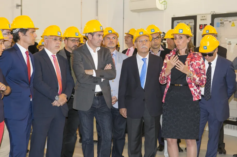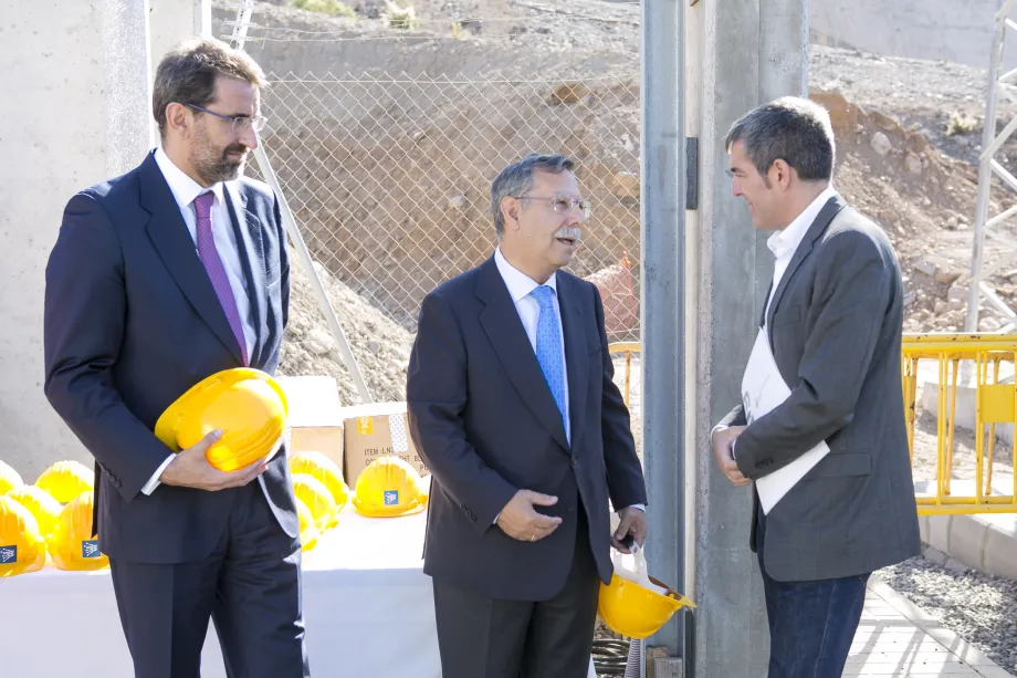 El consejero delegado de Red Eléctrica, Juan Lasala, y el presidente de la compañía, José Folgado, reciben al presidente del Gobierno de Canarias, Fernando Clavijo, a su llegada a la subestación de Santa Águeda.