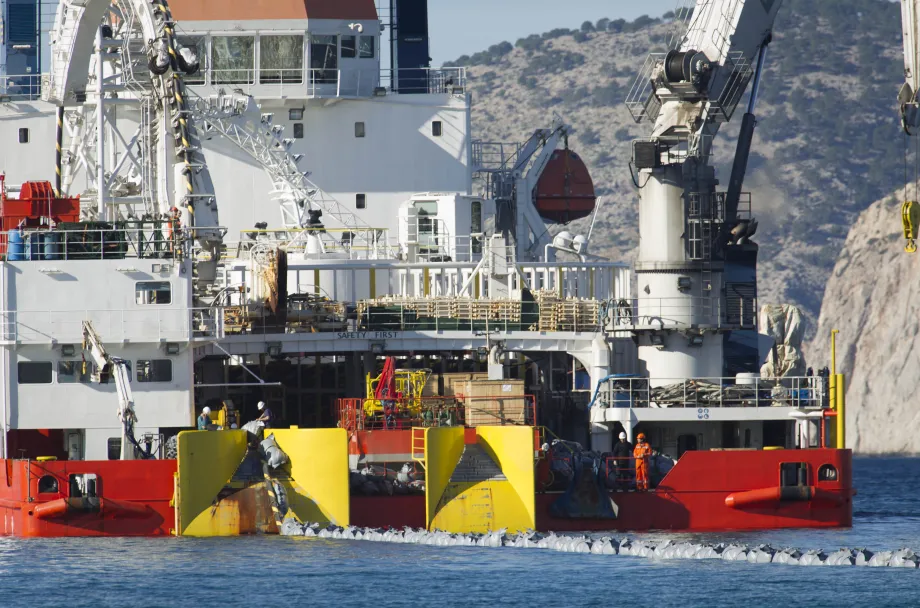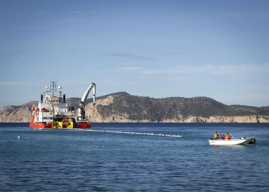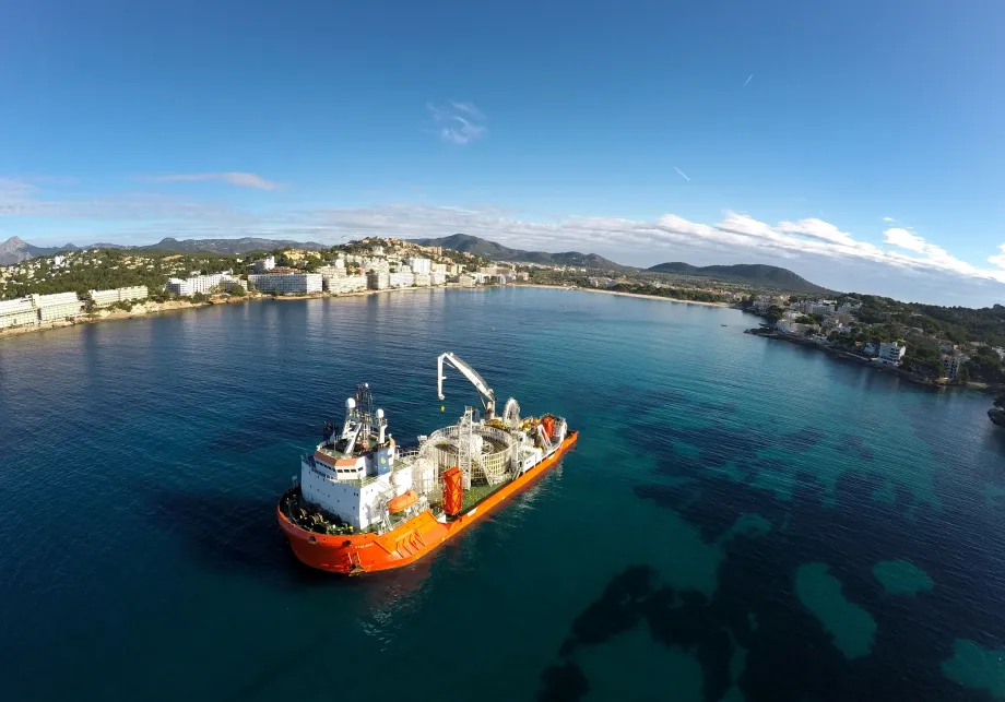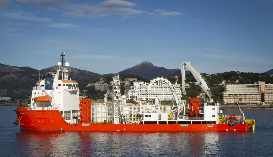 El barco 'Atalanti' durante los trabajos costeros ligados al tendido del segundo cable de la interconexión eléctrica entre Ibiza y Mallorca en la bahía de Santa Ponsa (Mallorca).