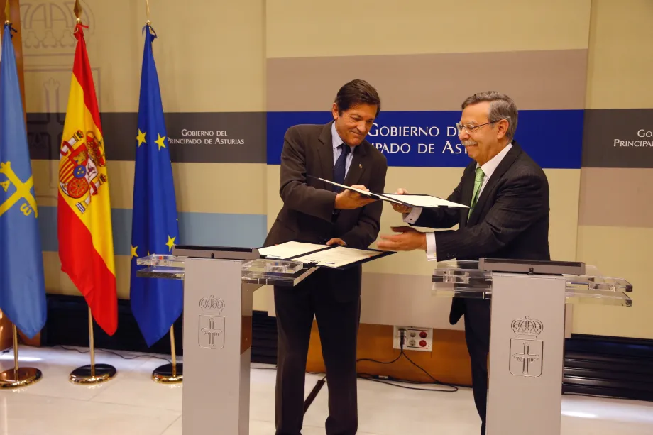 El presidente del Principado de Asturias, Javier Fernández, y el presidente de Red Eléctrica, José Folgado, durante la firma del convenio.
