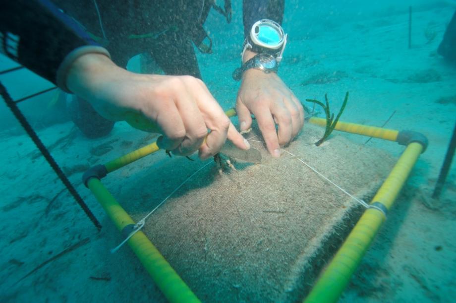 Proceso de plantación de fragmentos de 'Posidonia oceanica'.
