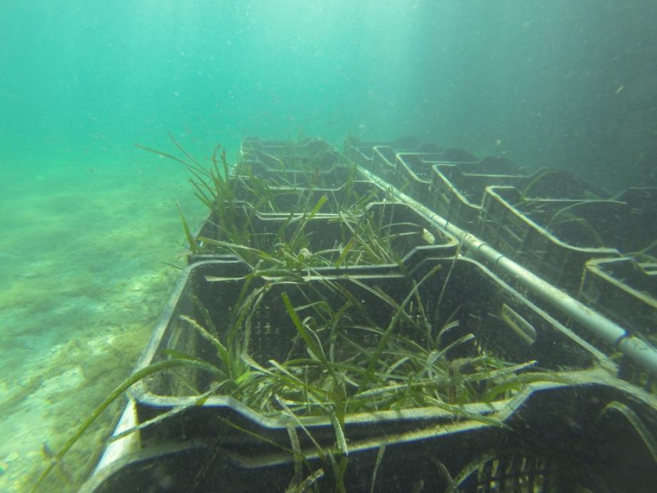 Cubetas de Posidonia sumergidas en el mar.