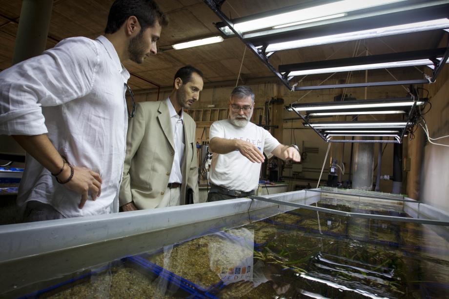 El investigador del IMEDEA, Jorge Terrados (derecha), explica cómo se ha desarrollado el cultivo de 'Posidonia oceanica' en laboratorios al jefe del Departamento de I+D+i y Proyectos Europeos de Red Eléctrica, Vicente González (centro) en presencia de Borja Álvarez, de la Demarcación de Transporte de Red Eléctrica en Baleares.