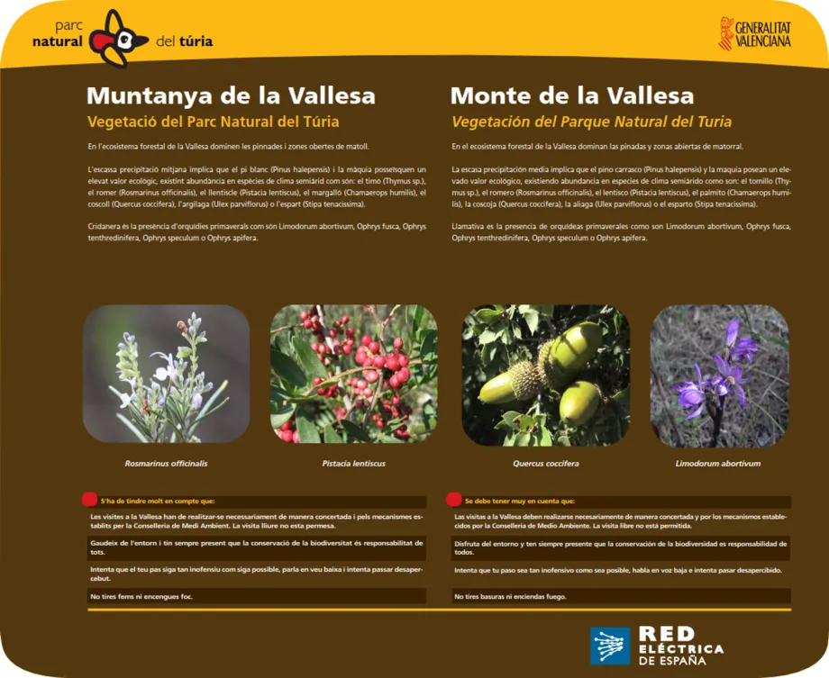 Red Eléctrica de España está llevando a cabo un proyecto de sostenibilidad en el paraje de la Vallesa, situado en el parque natural del Turia (Valencia), con una inversión total de 87.000 euros. El proyecto, iniciado en el 2017 y que concluirá en el 2019, contempla un conjunto de medidas en el ámbito de conservación de la biodiversidad y en la puesta en valor de los espacios naturales y del patrimonio histórico de este enclave ubicado en las cercanías de la capital valenciana.