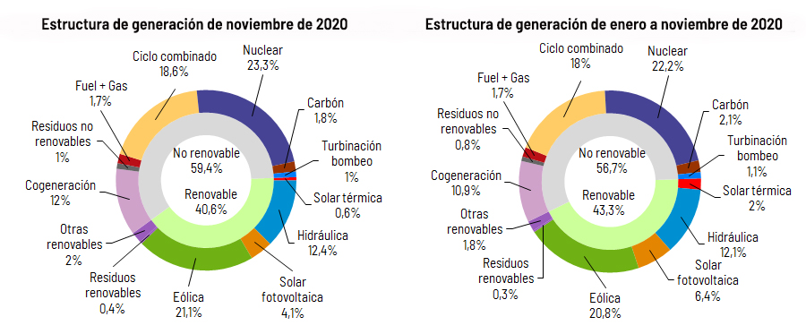 En el mes de noviembre, y según datos estimados a día de hoy, la generación procedente de fuentes de energía renovable representó el 40,6% de la producción. En lo que llevamos de año las renovables han producido un 13,4% más que en el mismo periodo de 2019. Así, de enero a noviembre de 2020, la generación renovable alcanza una cuota del 43,3% del total nacional.