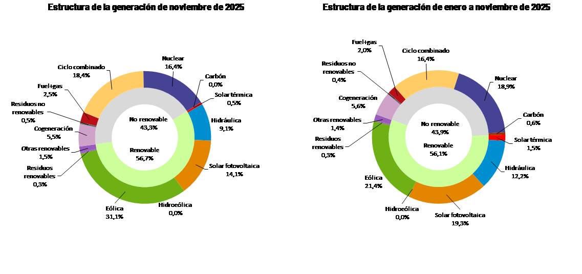Las renovables generaron este mes de noviembre un 21,9 % más que en el mismo mes de 2024 al registrar 12.655 GWh, lo que supuso una cuota del 56,7 % del total de la producción, según datos disponibles a día de hoy. Por otra parte, el 73,1 % de la producción eléctrica del mes procedió de tecnologías que no emiten CO2 equivalente.