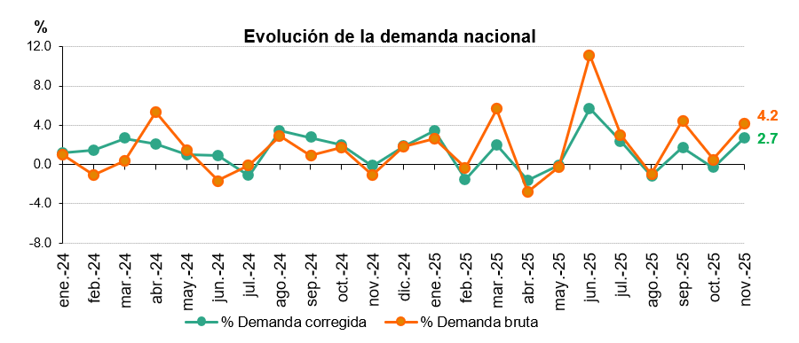 La demanda eléctrica nacional experimentó en noviembre un ascenso del 2,7 % con respecto al mismo mes del año anterior, una vez descontados los efectos de temperatura y laboralidad. En términos brutos, se estima una demanda de 20.728 GWh, un 4,2 % superior a la de noviembre de 2024.