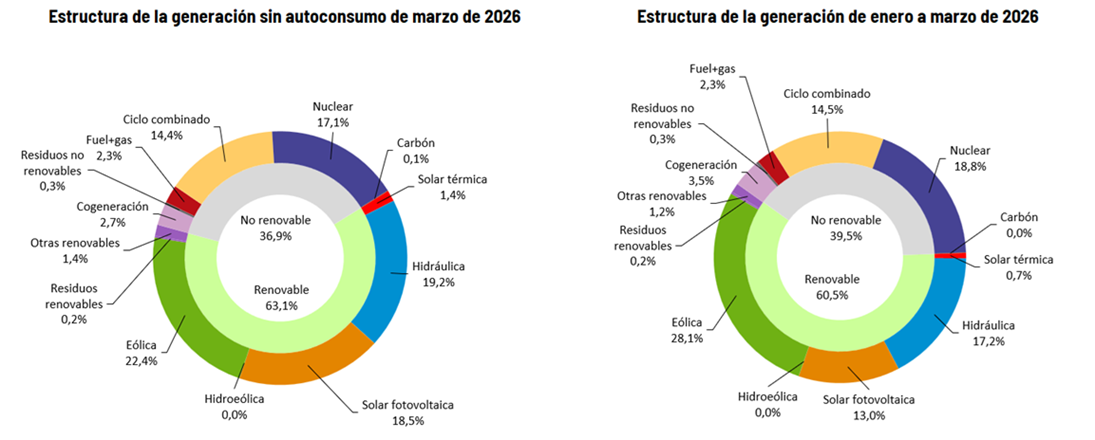 Las tecnologías renovables generaron este marzo un total de 14.484 GWh, lo que supone una cuota del 63,1% del total, similar a la alcanzada en febrero de este año. En el mes de marzo, el 80,2% de la producción eléctrica procedió de tecnologías que no emiten CO2 equivalente.