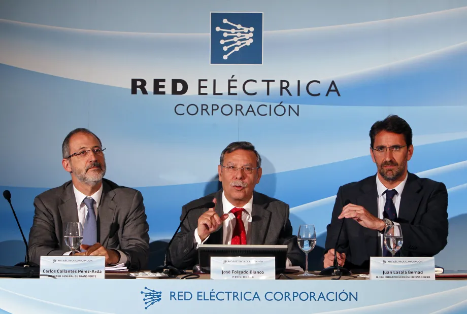 El director general de Transporte de Red Eléctrica (REE), Carlos Collantes; la directora de Asuntos Corporativos y Relaciones Institucionales de la compañía, Ana Cuevas, y el delegado regional de R